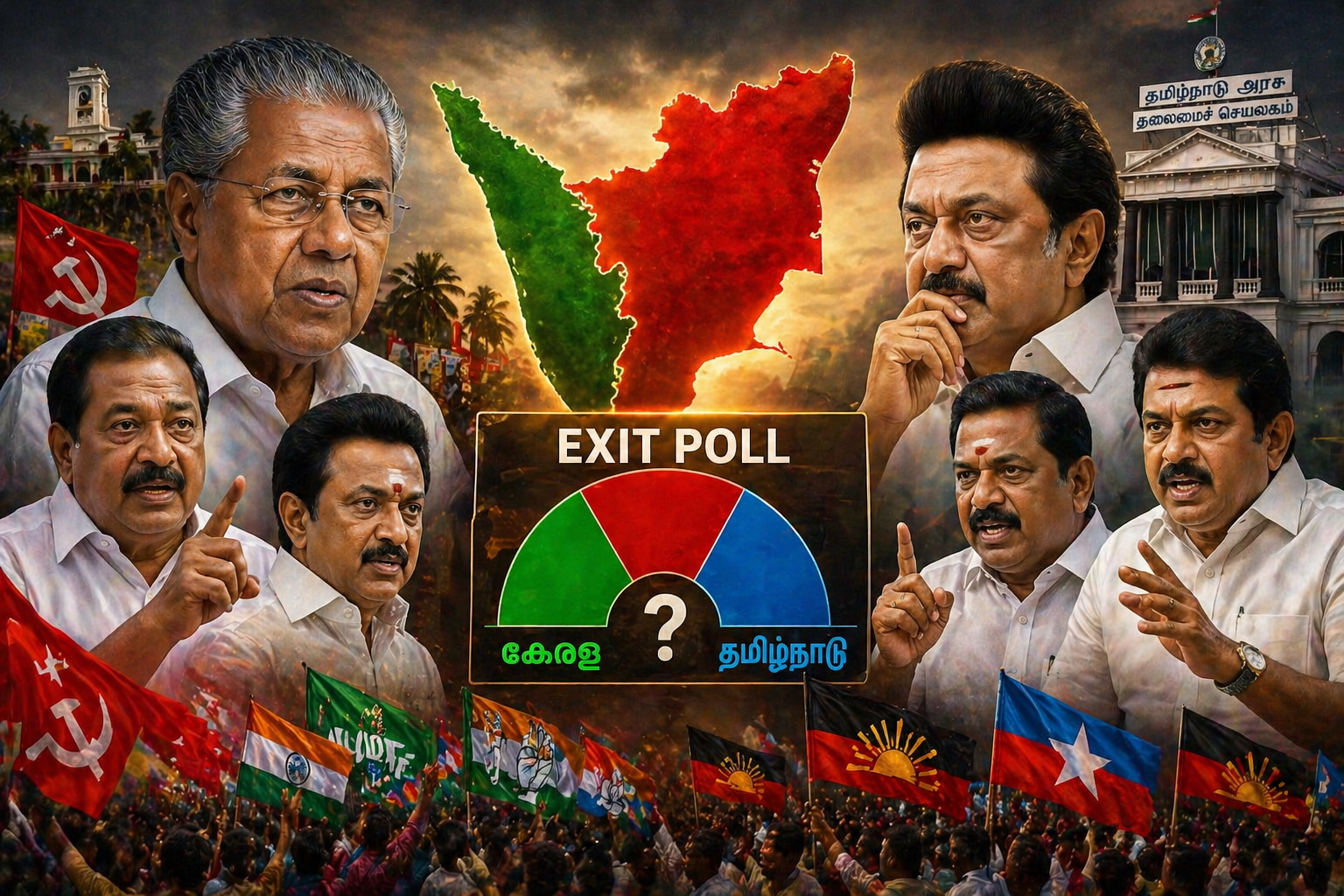 केरळ आणि तामिळनाडूतील विधानसभा निवडणुकांच्या एक्झिट पोलने राजकीय वातावरण चांगलेच तापवले असून दोन्ही राज्यांतील सत्तासमीकरणांमध्ये मोठी उलथापालथ होण्याची शक्यता व्यक्त केली जात आहे. मतदानानंतर समोर आलेल्या अंदाजांमुळे प्रमुख पक्षांमध्ये उत्सुकता आणि तणाव दोन्ही वाढले आहेत.